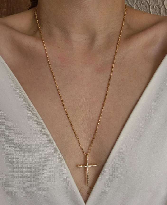 Colar longo com pingente de cruz cravejada, banhado a ouro 18k.